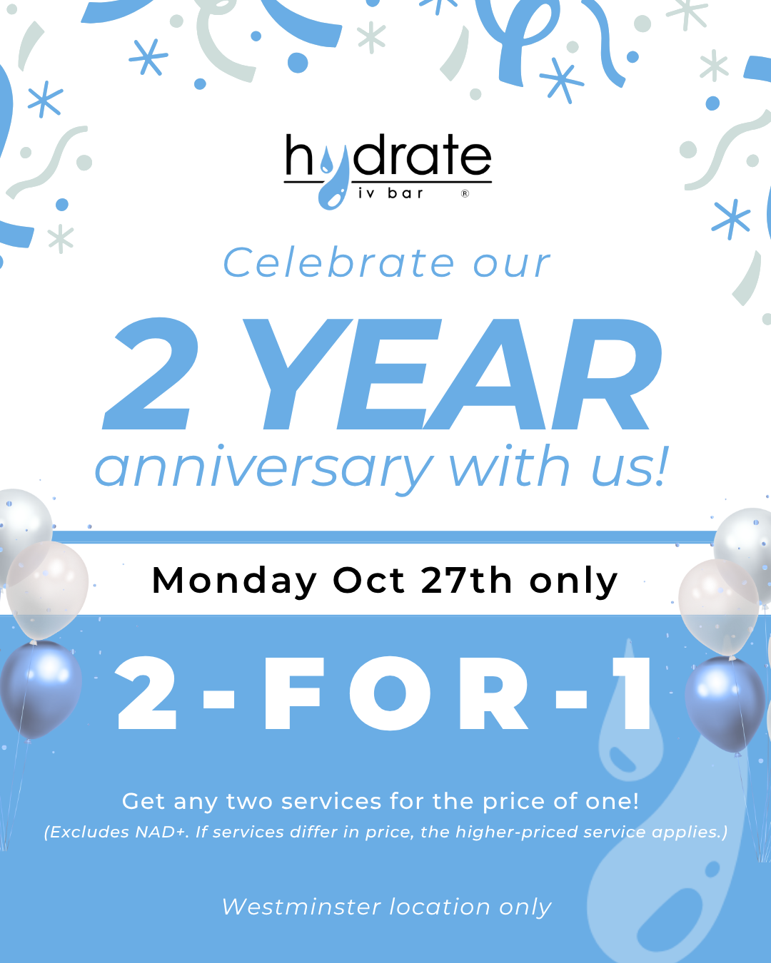 Come celebrate Hydrate IV Bar Westminster's 2nd Anniversary from 10am-6pm on October 27, 2025! To celebrate, Hydrate IV Bar Westminster will be offering [...]